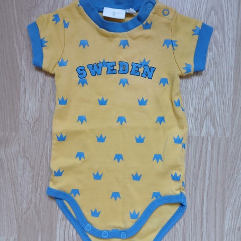 Blå/gul fotbollsbody (H&M) med Sverige-emblem på bröstet. Tryckknappar i grenen och korta ärmar, perfekt för den lilla supportern.