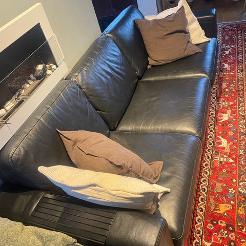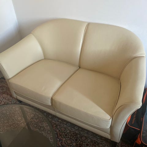 Fin soffa i läder. Fint skick dock lite slitage i lädret på ngt ställe, men inget som stör direkt. Finns även en fotpall.