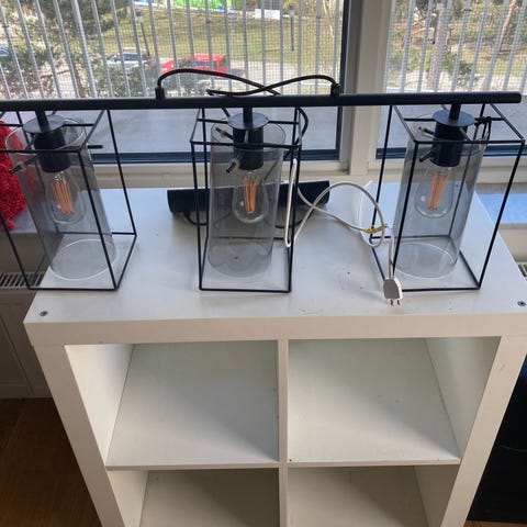 Taklampa Kroby från Ikea. Justerbar bredd, 27cm lampkupor. Liten skada på en skärmen(se bild)