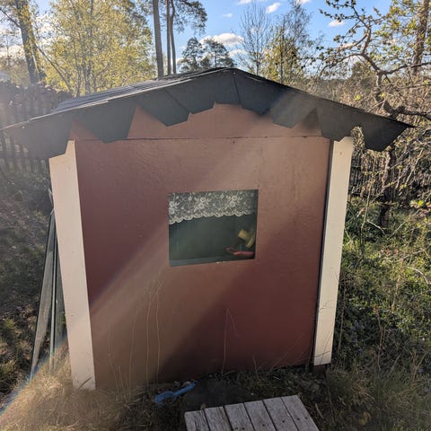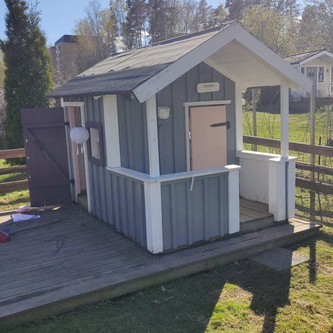 Fin liten lekstuga i trä med veranda och ett fönster på en av sidorna av huset samt i dörren. Invändigt är väggarna målade i rosa och vitt av barnen själva och det finns plats för leksaker eller förvaring. En gammal men fortfarande användbar och fin lekstuga att ha skoj i!