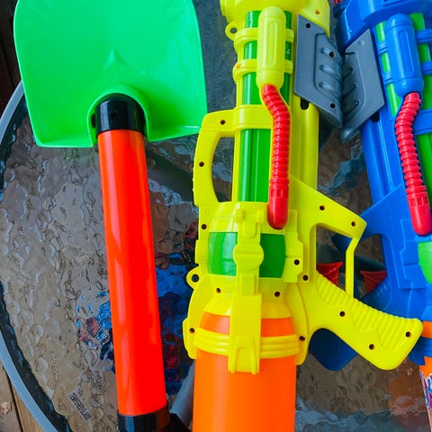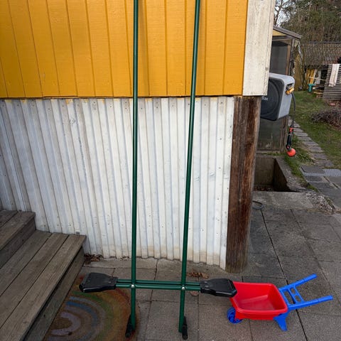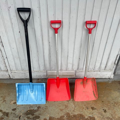 Tre barnredskap för sandlådan: två spadar och en kratta i olika färger. Långa skaft som är lätta för barn att hålla i.