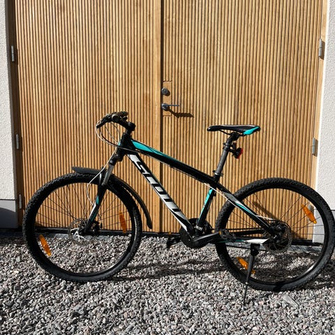 Merida mountainbike i ramstorlek XL med 29"-hjul och raka styren. Utrustad med skivbromsar och kombipedaler med klick på ena sidan.