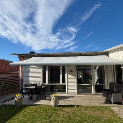 Stort markissystem (4 stycken 5 meters markiser) för uteservering eller större uteplats, monterat på fristående stolpar. Ger rejäl skugga över ett större område och har en stabil konstruktion i metall med duk ovanpå.