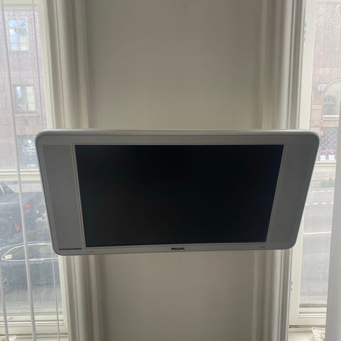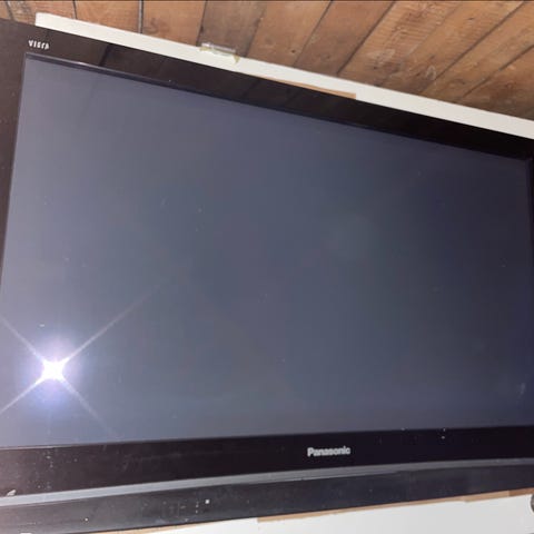 Panasonic Viera TV med svart ram och inbyggd högtalarlist nedtill. Baksidan har flera anslutningar som HDMI, SCART och komponent för olika enheter.