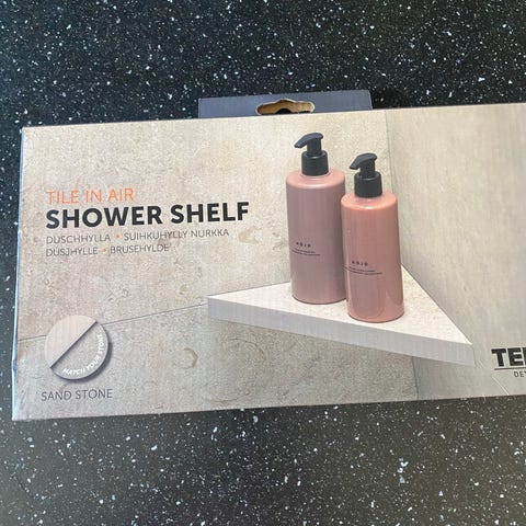 Vit hörnhylla för dusch eller badrum med 4 plan för schampo och tvål. Fästs mot vägg/golv med stång så den står stadigt i hörnet.