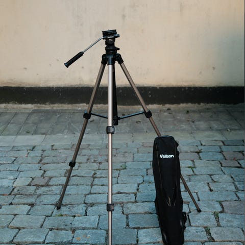 Velbon CX-460 kamerastativ i metall med justerbara ben och vev för höjdreglering. Svart bärväska med axelrem följer med för enkel transport. Pris är ej hugget i sten