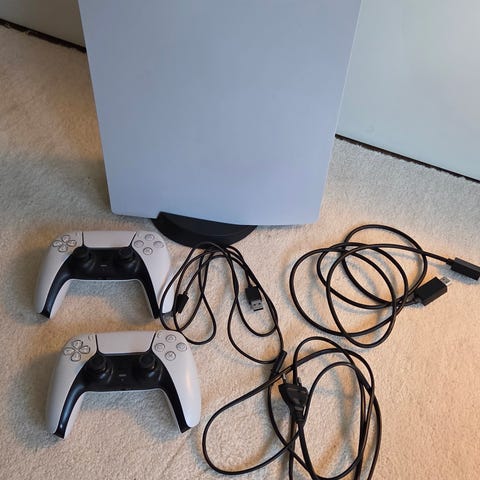 Sony Playstation 5 spelkonsol med två DualSense-handkontroller, en vit och en rosa. Står på rund fot och har anslutningar fram för USB och nätström. Ingår en hyper x solocast mic som funkar riktigt bra.