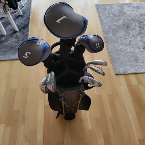 Nybörjarset med Olyo golfklubbor med stålskaft och headcovers, samt matchande bärbag med benställning. Bagen har flera fickor på sidorna för förvaring av bollar och annat smått. Allt du behöver för att börja spela golf. Inköpt maj 2025. Nypris 4995kr