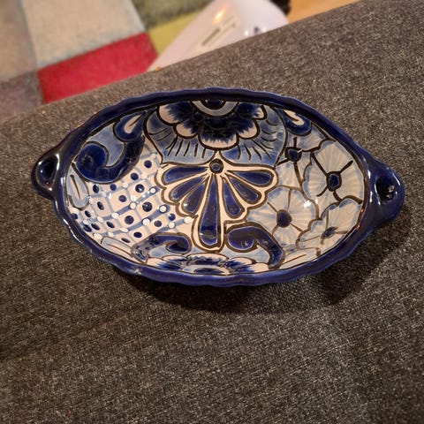 Vacker keramikskål i blått och vitt med handmålat mönster. Har rund form med lite högre kant och stämpel undertill.