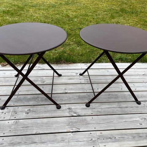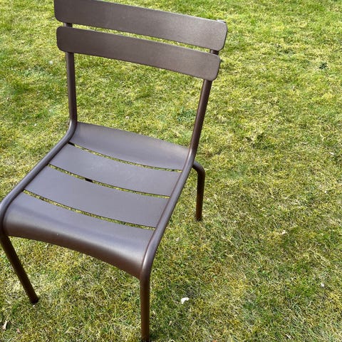 Fermob. Rektangulärt matbord för utomhus bruk, brunlackerad metall. Hål i mitten av skivan för parasoll. Bredd 77 cm, längd 116 cm
