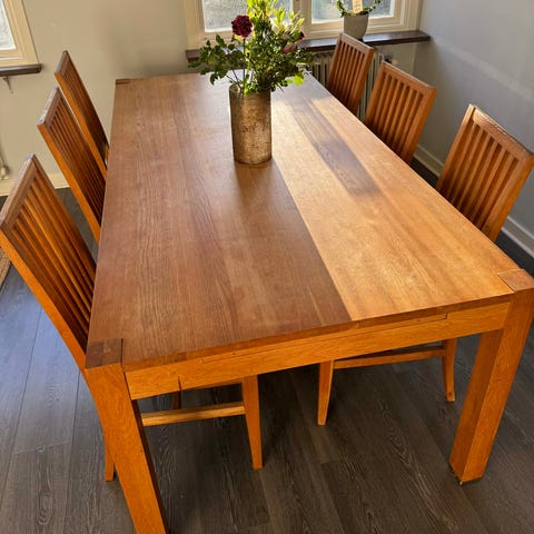Matbord i ek 1800x1000 mm, iläggsskiva 500mm samt 6 st stolar med klädd sits i skinn imitation.