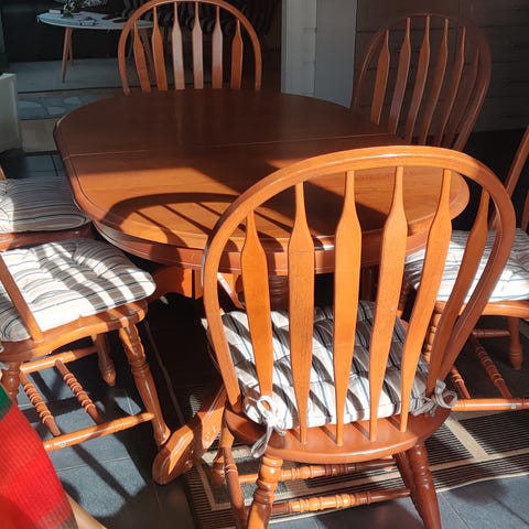 Bordets bredd är 85cm, längden är 135cm. två extra skivor vid varje sida på 42,5 cm. totalt längd blir 220cm. Både bordet och stolarna är väldigt stadiga och har används ett få antal gånger och det stod bara i vardagsrummet. Bilden är ljus och det är mycket finare än i själva bilden.