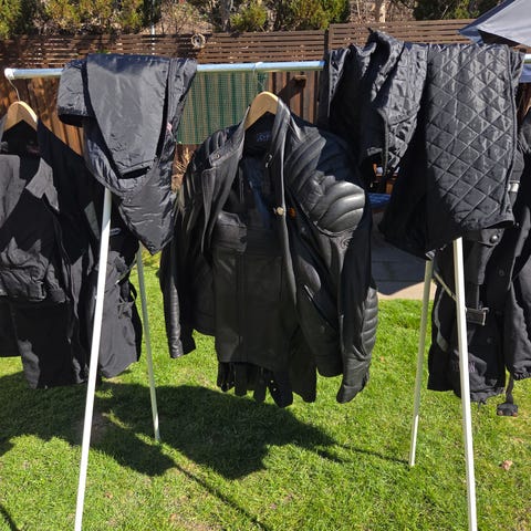 Mc‑ställ från Jofama med jacka och byxa i svart med beige detaljer, jackan i stl L Jackan har dragkedja och justerbara spännen i midjan och ärmarna, byxorna har dragkedja nertill och fickor i sidorna.