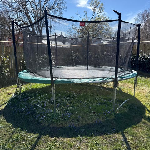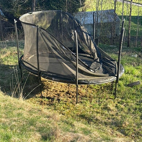 Rund trampolin med skyddsnät runt om och öppning med dragkedja. Har stege framtill och stabil ram i metall.