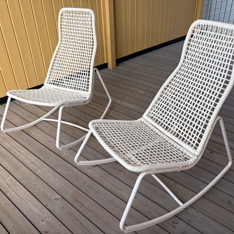 Två Ikea Högsten underhållsfria utomhusfåtöljer i konstrotting, 500kr för bägge.