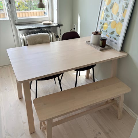 En av IKEAs finaste kollektioner, Nornäs. Stort matbord i massiv furu med slipad och såpad bordsskiva. En extra förlängningsklaff kommer med, sitter egentligen monterad på ena sidan men vi har haft den undanstoppad.