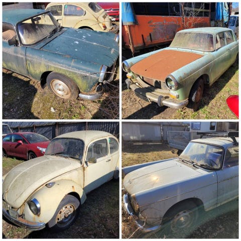 Tre kompletta dörrar med handtag, gångjärn och inredning och en dörr som saknar inredning och handtag. Bra skick, endast lite rost. 500 kr för alla fyra