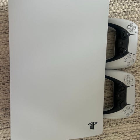 Sony Playstation 5 med vit och svart design. Två trådlösa handkontroller i samma stil följer med på bilden. Modell CFI-1116A