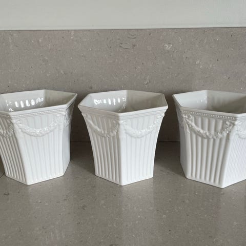 Hexagonal form med räfflad dekor, pärlstav och girlander.