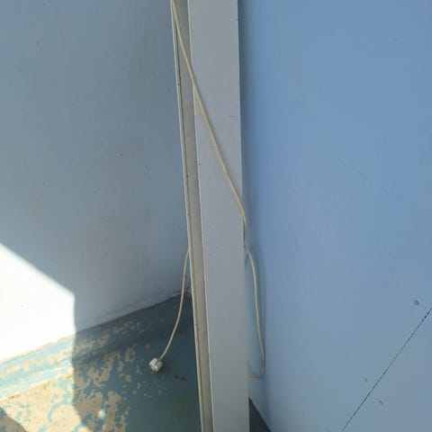 Vit Anders Pehrson plåt lampa den sk supertube hängande i kedjor, lysrörslampa, använd över skrivbord eller som växt belysning. Välvårdat skick. Mått 98 cm lång o 17 cm bred ca.