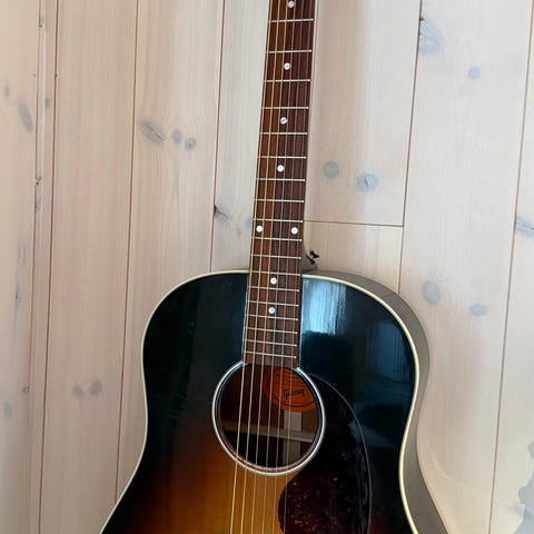 Säljer den för 1500 pga skicket - en lagad spricka över halva kroppen och glapp i mikrofonen. Små repor fram och bak. Men används den som en akustisk gitarr så fungerar den bra.