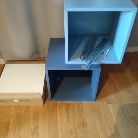 8 st lådor Blå-Gröna till IKEA Kallax bokhylla. Hämtas i Åkersberga. 33x38x33 cm. Bokhyllan på bilden ingår ej. Nypris 400:-.