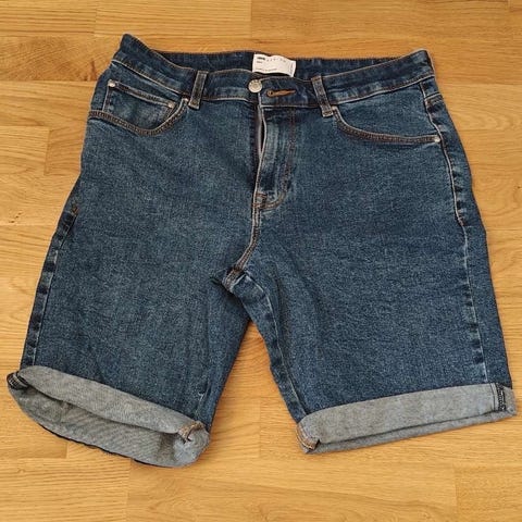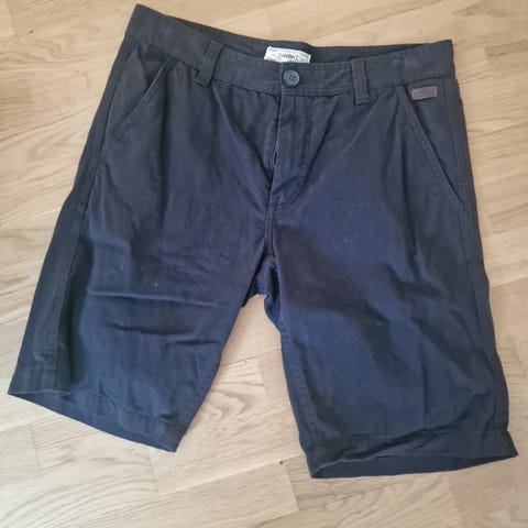 Blå jeansshorts från Dressmann i stl M, i kraftigt denimtyg. Klassisk femficksmodell med hällor för skärp och gylf med knappar/dragkedja framtill.