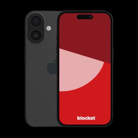 Apple iPhone 16 med 64 GB lagring i svart. Stor skärm på framsidan och dubbla kameror på baksidan.