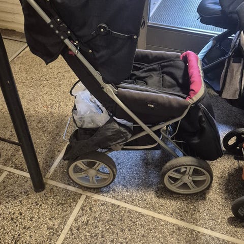 Emmaljunga sulky med svart sits och sufflett. Har varukorg under, nätkorg på sidan och stora hjul som är lätta att rulla.
