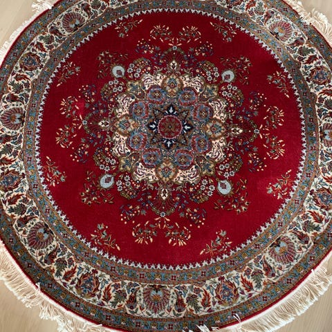 Detta är en rund persisk matta med ett intrikat, traditionellt blommönster och fransar.