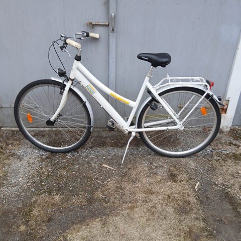 Vit Crescent stadscykel för kvinna med 28" hjul och ramstorlek M. Utrustad med korg fram, pakethållare bak och stänkskärmar. Saknar kedjeskydd.