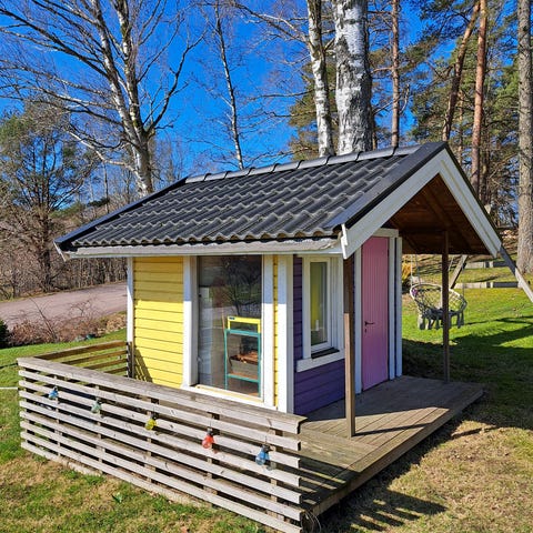 Mysig liten stuga med stor altan och randig markis över uteplatsen. Tomten har gräsyta, gång av plattor och en grön portal med klätterväxter.
