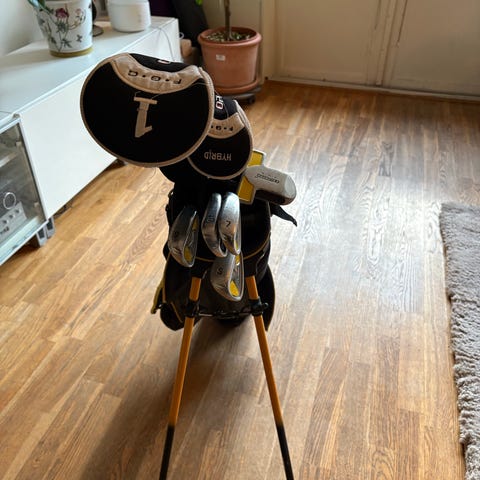 Säljer ett litet set golfklubbor med putter och några järnklubbor. Skaft i svart med grepp upptill och klubbhuvud i metall, bra för dig som vill fylla på bagen enkelt. Alla är open klubbor som passar någon som är ca 12-14 år eller (150-170cm) förrutom puttern som är ett annat märke