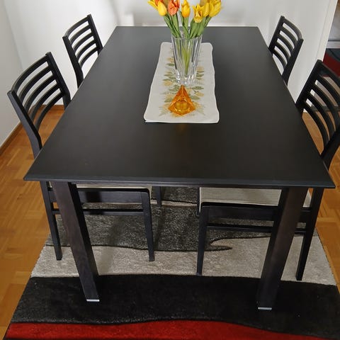 Bordet är stabilt och rymligt, med plats för både vardagsmiddagar och större sällskap. Stolarna är bekväma med en stilren design som passar i de flesta hem.