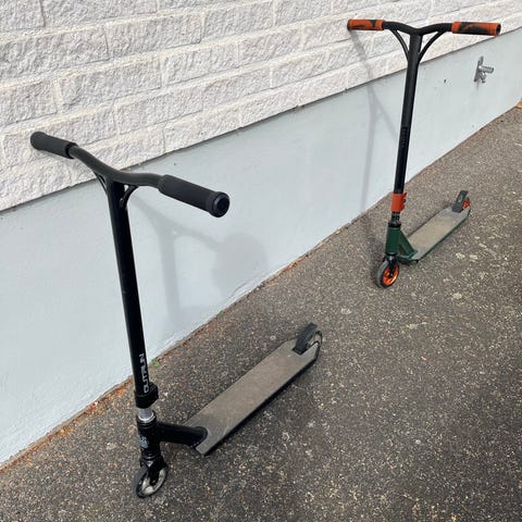 Kickbike i svart med orange detaljer på hjul och handtag. Stabil modell med T-styre och fotbroms bak.