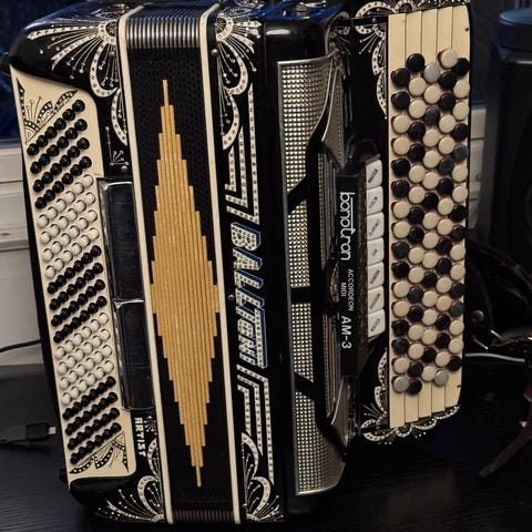Blått dragspel med många knappar och klassiskt utseende. Fint mönster på framsidan och remmar för att hänga över axlarna.