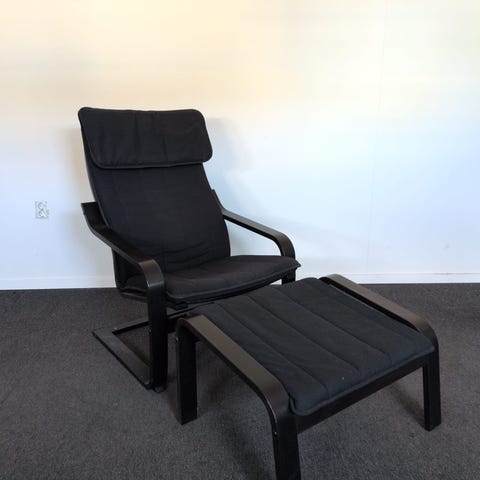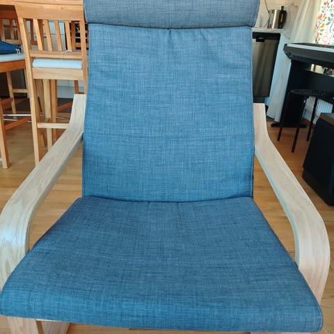 Säljer en fåtölj från IKEA av modell Poäng i ljust böjträ och med grå, tjock dyna.