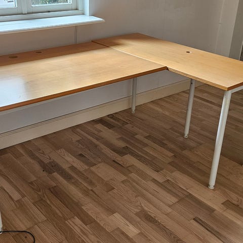 Stort skrivbord med låsbara hjul som går att höja och sänka (manuellt).