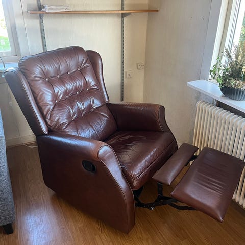 Mörkgrå reclinerfåtölj med inbyggt fotstöd som fälls ut. Har mjuk stoppning, hög rygg och styrs med en enkel handkontroll vid sidan. Använt med bra skick. Ca 12 år gammal.