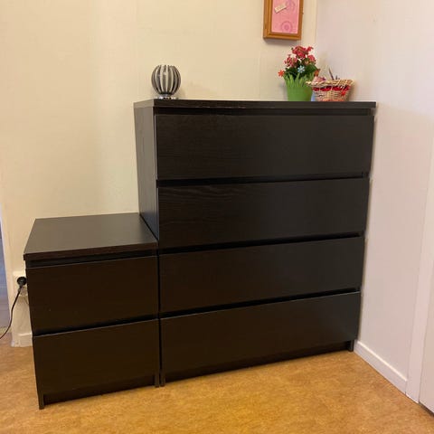 6 lådor. Överdelen kan fällas upp och har en spegel. Lite skavd i det bakre hörnet, fläckar i några av lådorna (se bilder för exempel). I övrigt bra skick.