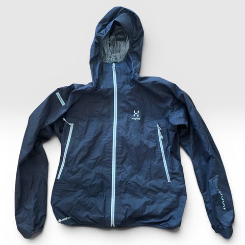 Svart dunparkas från Haglöfs i stl XL med huva och genomgående dragkedja fram. Två fickor i sidorna och quiltad, längre modell som går ner över låren.