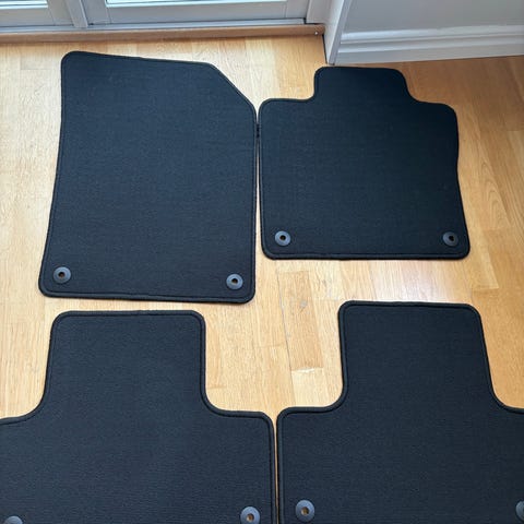 Svarta tygmattor till bilens framgolv med fästen vid nederkanten. Undersidan är gummerad och kan lätt tas ut för rengöring.