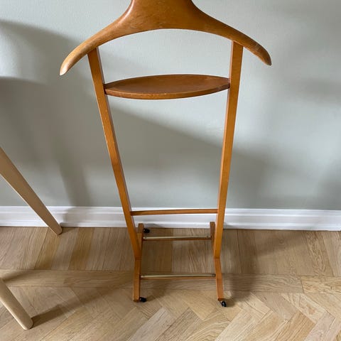 • Funktion: Galge för kavaj, byxhängare, samt en integrerad bricka för småförvaring (klocka, ringar, mynt). Krokar på sidorna för slipsar eller bälten.