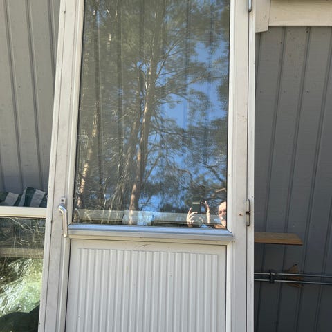 Vit altandörr med karm. Karm-mått 80 cm x 210 cm. Trä insida och aluminium utsida. Fint skick. Handtag, persienn, låscylinder + nyckel medföljer. Högerhängd. 3-glasfönster. Passar bra där man vill få in mycket ljus genom dörren.