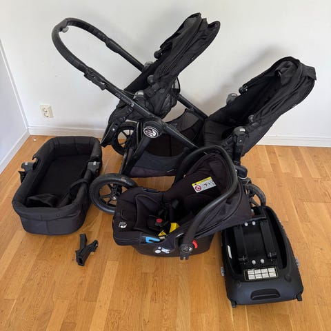 Baby Jogger City Elite 2 i mörkgrå/svart med tre stora punkteringsfria hjul och fullt liggläge. Har justerbart (steglöst) ryggstöd, fempunktssele, tittlucka och vädring i suffletten samt stor varukorg under vagnen. Suffletten går att fästa på vagnen på två olika höjder. På bilderna sitter den högst upp. Det är väl täckande och har spf 50. Vagnen har förvarats inomhus och bevarat färgen väl.