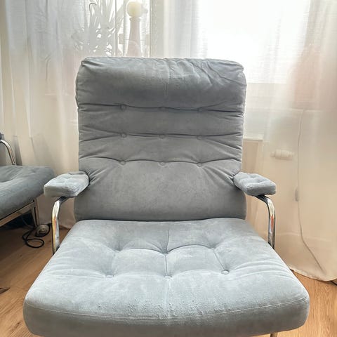 Fåtöljerna är fullt fungerande, men skulle behöva lite kärlek för att återfå sin forna glans och priset speglar detta. Som bilderna visar har klädsel och dynor slitage, fläckar och smuts, och sitsarna uppvisar revor och lagningar vid infästningspunkterna mot stommen.