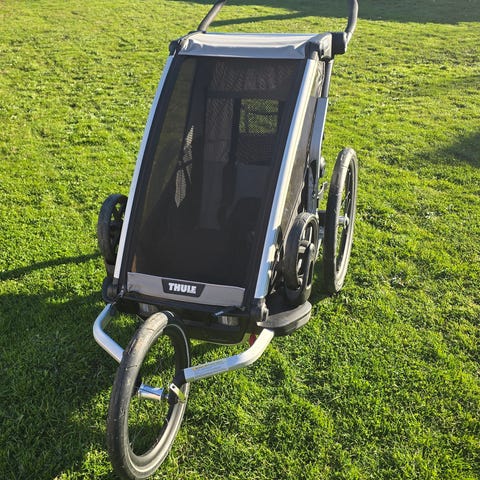 Thule dubbelvagn som kan användas som cykelvagn eller joggingvagn, svart med ljusgrå detaljer. Två sittplatser med separata selar och praktisk förvaring bakom handtaget.