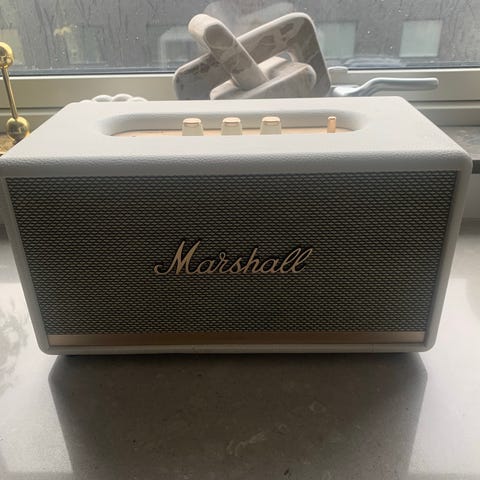 Marshall högtalare med klassiskt tygfront och tydlig logga fram. Har reglage på ovansidan för volym och ljudinställningar.