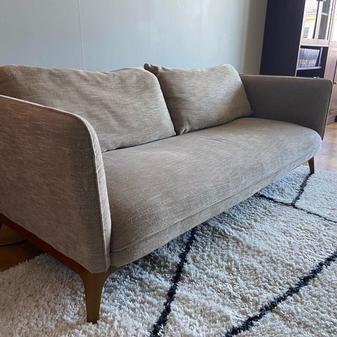 Dynor i kallskum, kuddar i dun, avtagbar klädsel. Mindre fläckar och nötning finns. Se bilder.