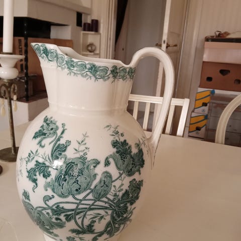 Fin porslinskanna med matchande skål i rödvit dekor.